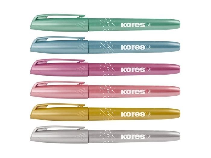 Kores Europe s.r.o., Nivka 336, 378 53 Strmilov, Česká republika, Tel.: +420 222 540 558, kores@kores.czKores třpytivé zvýrazňovače/ popisovače jsou určeny pro plynulé zvýrazňování textu a dekorativní popisování na všech typech papíru. Jemný třpytivý inkoust dodá textu decentní lesk při zachování jeho čitelnosti.