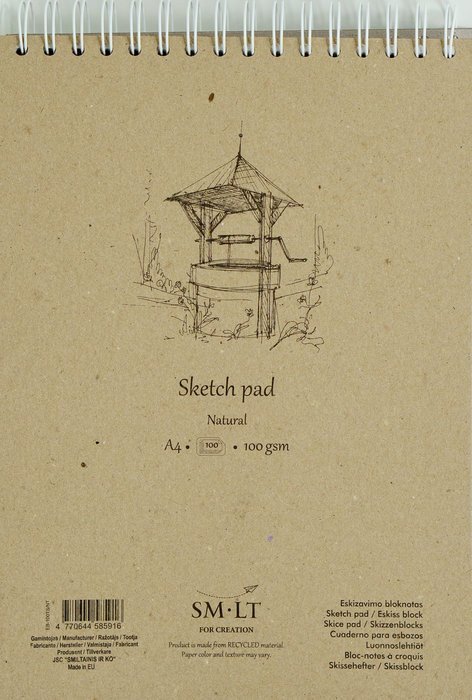 Blok A4 se 100% recyklovaným papírem. Papír má šedý odstín a malé nerovnoměrné tečky. Obsahuje 100 listů o gramáži 100 g/m2. Nejlepší pro tužky, pera, křídy, uhel. Vnitřní strana papíru je certifikována FSC. S obalem z přírodního kartonu, tvrdými zády, mikroperforovanými listy a spirálou na horní straně.