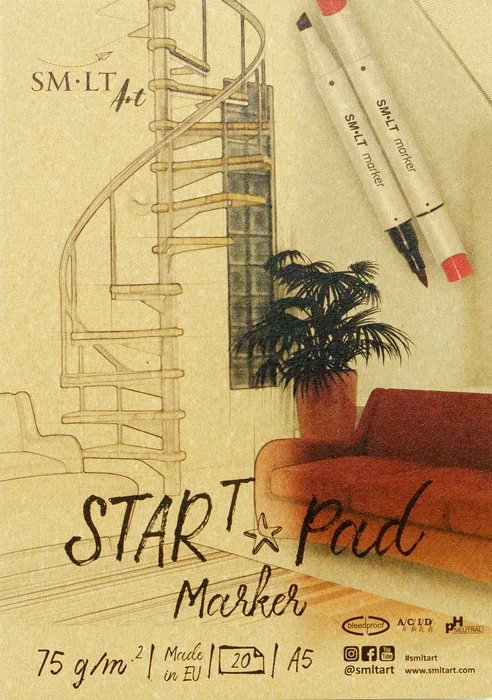 Blok na fixy a Markery START "SMLT Art" Speciální bílý hladký jednostranně křídový papír odolný proti prosakování. Nejlepší pro fixy a gelová pera. Vnitřní strana papíru neobsahuje kyseliny a je pH neutrální. S tvrdým hřbetem a obalem ze 100% recyklovaného materiálu.
