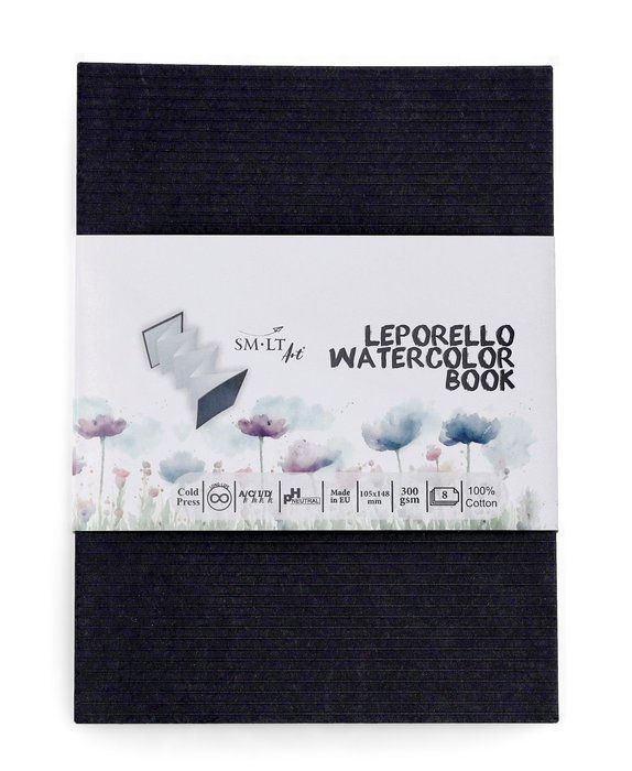 Leporelo z přírodně bílého akvarelového papíru ze 100% bavlny. Formát 105x148, obsahuje 8 listů, gramáž 300 g/m2. Povrchová textura Cold Press má vynikající schopnost zvedat barvy. Tento papír je oceňován profesionálními i amatérskými tvůrci a nabízí dobrou kvalitu za přijatelnou cenu. Jedná se o papír s dlouhou životností, bez kyselin a s neutrálním pH. S tvrdými kartonovými deskami.