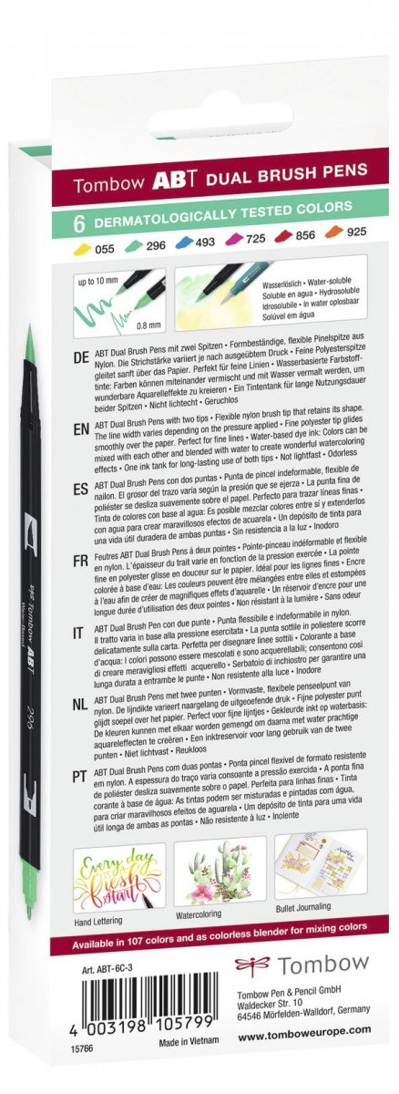 Pakiranje sadrži sljedeće flomastere ABT Dual Brush Pen: ABT-055, ABT-296, ABT-493, ABT-725, ABT-856, ABT-925.
