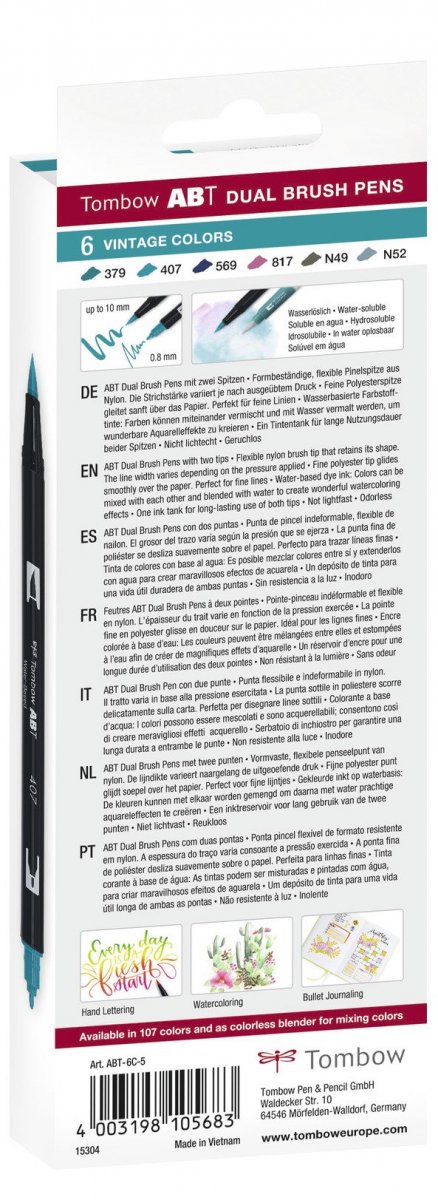 Pakiranje sadrži 6 flomastera ABT Dual Brush Pen: N49, N52, 379, 407, 569 a 817.